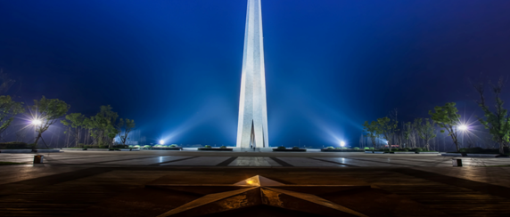 這是勝利塔,“擎天柱”外形,總高度是99米,以“九九八一”寓意“八一”軍隊的勝利,細心的人不難發現,其一、塔是五邊形,塔頂一定是一個若大的五角星,其二、從雕像到勝利塔之間的距離,中間還有8顆碩大的五角星,若是俯瞰,把這三幅畫連在一起,一定能看到一副完善的畫卷,戰艦、五角星、勝利塔,猶如一艘乘風破浪的巨艦在保護和守衛著巢湖,正如一首歌名《眾人劃槳開大船》。