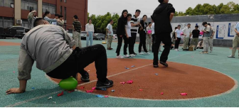 第二項進行的是“合力吹氣球”,共有六組參加,每組4人,每個人分工不同,吹、扎、運、破,完整的運送5個氣球并用屁股坐破所用的時間最短為獲勝。這個項目不僅考驗體力活、手工活,還考驗足夠強大的肺活量