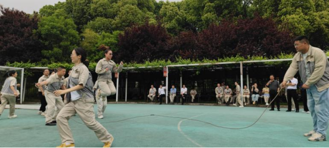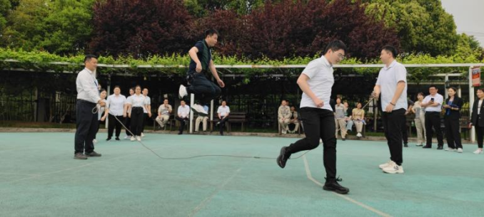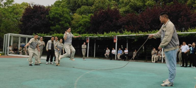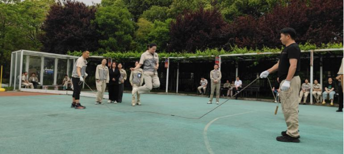 首先進行的是穿龍跳繩比賽。每支參賽隊伍由 10 名隊員組成,其中 2 人搖繩,8 人跳繩。隨著裁判的一聲哨響,搖繩的隊員迅速揮動手中的繩子,跳繩的隊員們則如敏捷的飛燕,一個接一個地穿過飛舞的跳繩。他們步伐整齊,節奏一致,口中喊著響亮的口號,為了團隊的榮譽而奮力拼搏。現場觀眾的加油聲、歡呼聲此起彼伏,整個賽場沉浸在一片歡樂的海洋中。這個項目不僅考驗了大家的協調性和敏捷性,還考驗了團隊成員之間的默契。有的隊伍配合得天衣無縫,動作流暢;有的隊伍則在歡聲笑語中出現了一些小插曲,但正是這些小插曲,為運動會增添了不少樂趣。