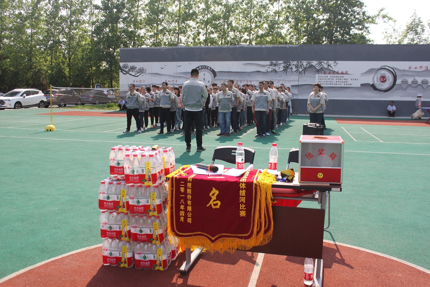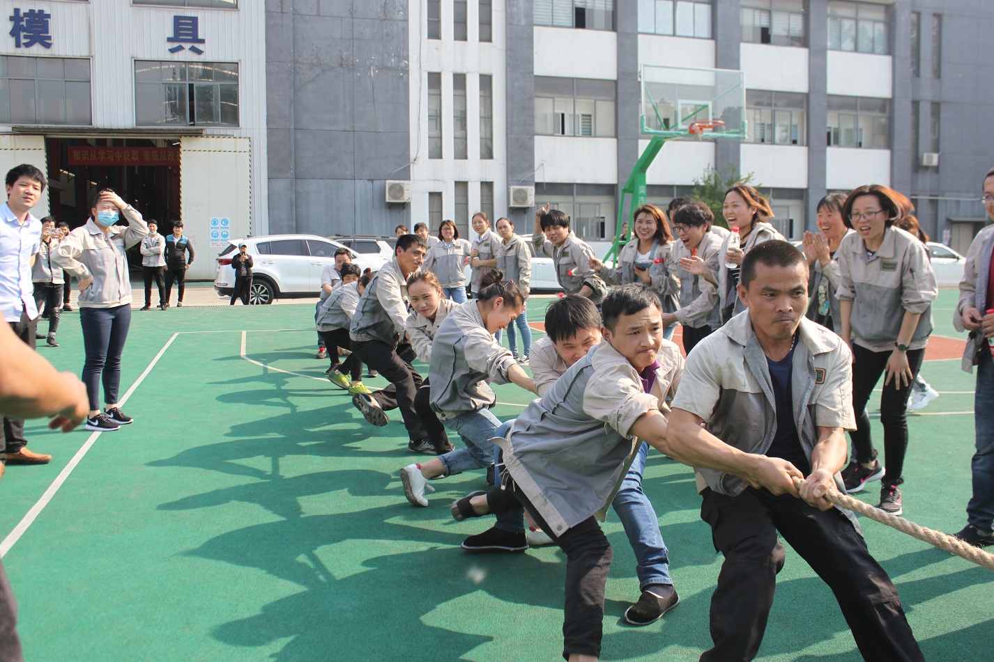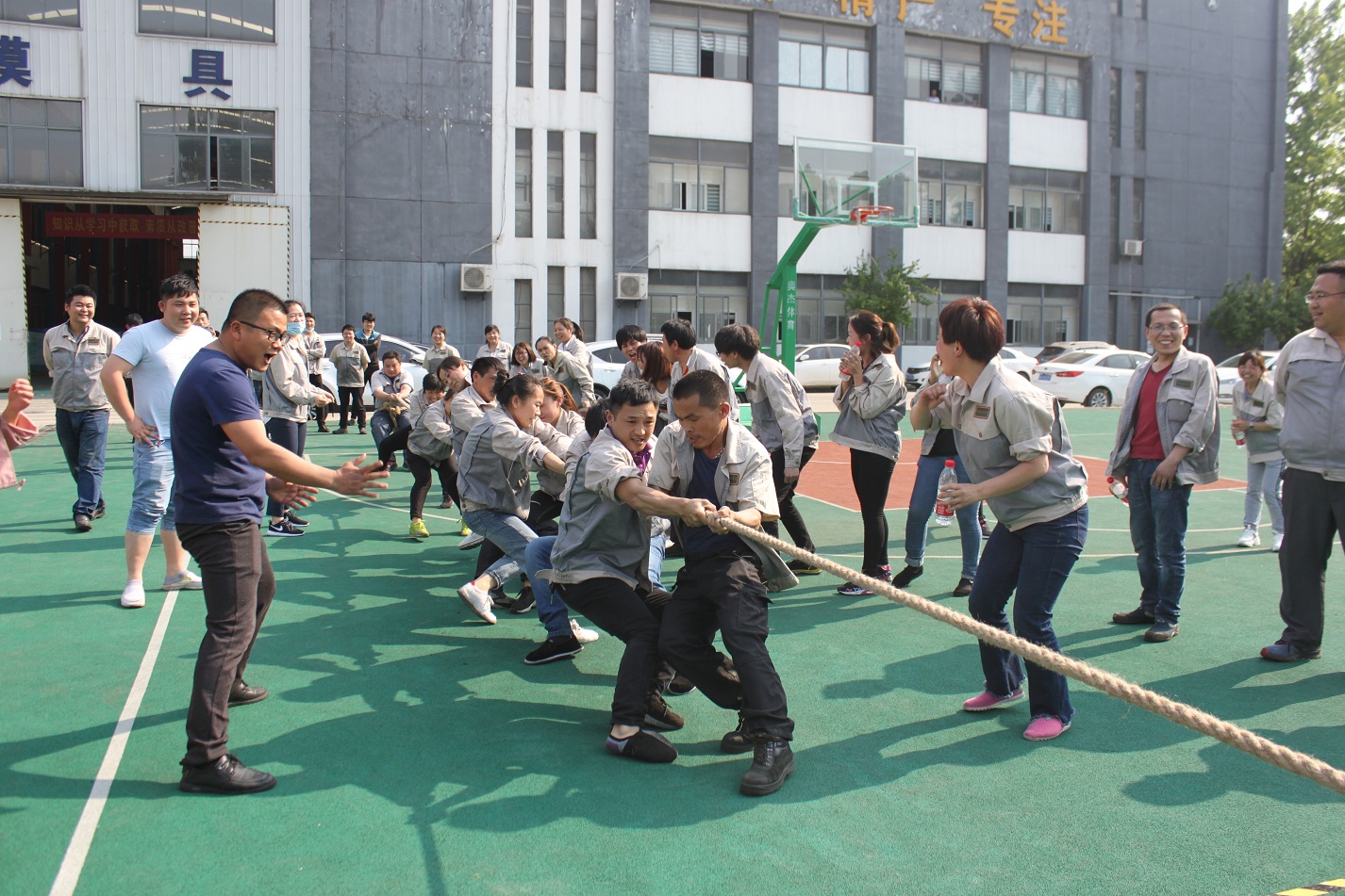 首先進(jìn)行的活動(dòng)是拔河,參與活動(dòng)的共有七支隊(duì)伍,分別是:鈑金事業(yè)部一戰(zhàn)隊(duì)、鈑金事業(yè)部二戰(zhàn)隊(duì)、彩晶事業(yè)部戰(zhàn)隊(duì)、模具事業(yè)部戰(zhàn)隊(duì)、鈑金加工部戰(zhàn)隊(duì)、惠爾科戰(zhàn)隊(duì)、職能部門戰(zhàn)隊(duì),每個(gè)戰(zhàn)隊(duì)分別由5男5女組成,共10人。