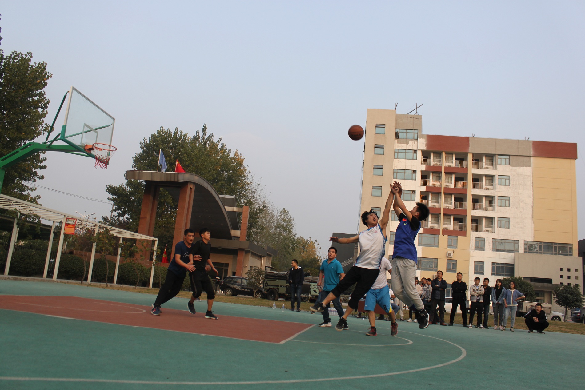 短暫的中場休息過后,是綜合隊和鈑金隊比賽,這兩個隊又是一場激戰,因為雙方都有非常優勢的主力戰將,在爭奪投球和籃板球時,你來我往、互不相讓,兩隊分數也是相差無幾,每次綜合隊領先時,鈑金的分數就緊隨其后,但從未被超越過,最終綜合隊以微弱的優勢,鎖定了勝局。
